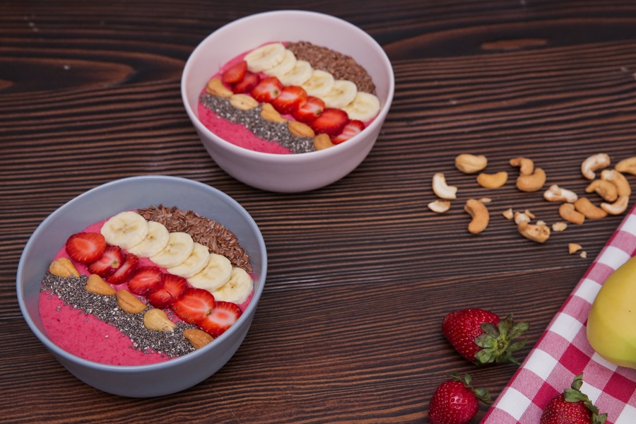 - Üzeri için meyveleri dilimleyin. Sırasıyla keten tohumu, muz, çilek, kaju ve çiya tohumunu şeritler halinde dizin.